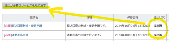 提出済みの場合「提出が必要なサービスを取り消す」という箇所を押下すると、 旧データが解除されて、新規申請ができるようになります。