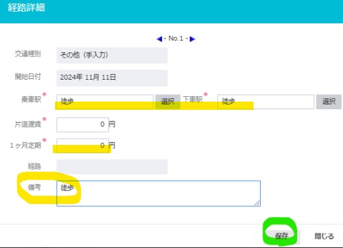 A2:経路に「徒歩」、金額「ゼロ円」、備考に「徒歩通勤」と登録してください。